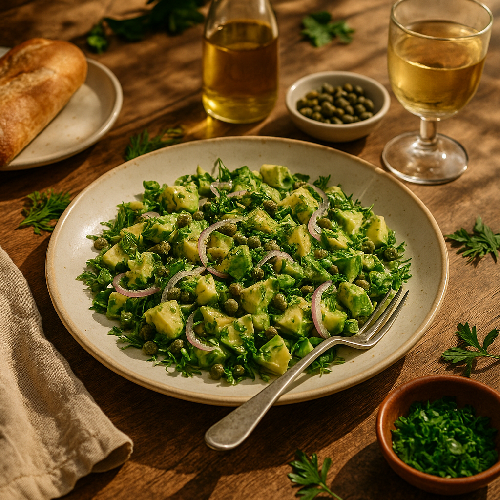 It’s creamy without being heavy, sharp without being aggressive, and briny in that quiet, grown-up way that suggests olives, good wine, and a table that gets wiped down with a linen towel instead of a paper one. Ripe avocado forms the soft landing. Capers bring the salt. Shallots add bite. Fresh herbs do the heavy lifting, making the whole thing feel intentional instead of accidental.