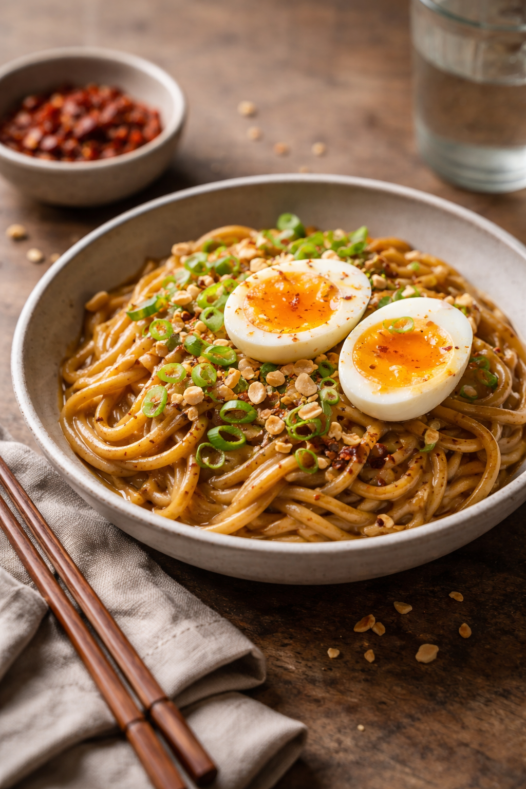 Some nights call for ambition. Others call for peanut butter and acceptance. Weeknight Peanut Noodles with Jammy Eggs live squarely in the second category. This is a bowl of noodles that looks glossy, tastes intentional, and comes together before your nervous system has time to spiral.