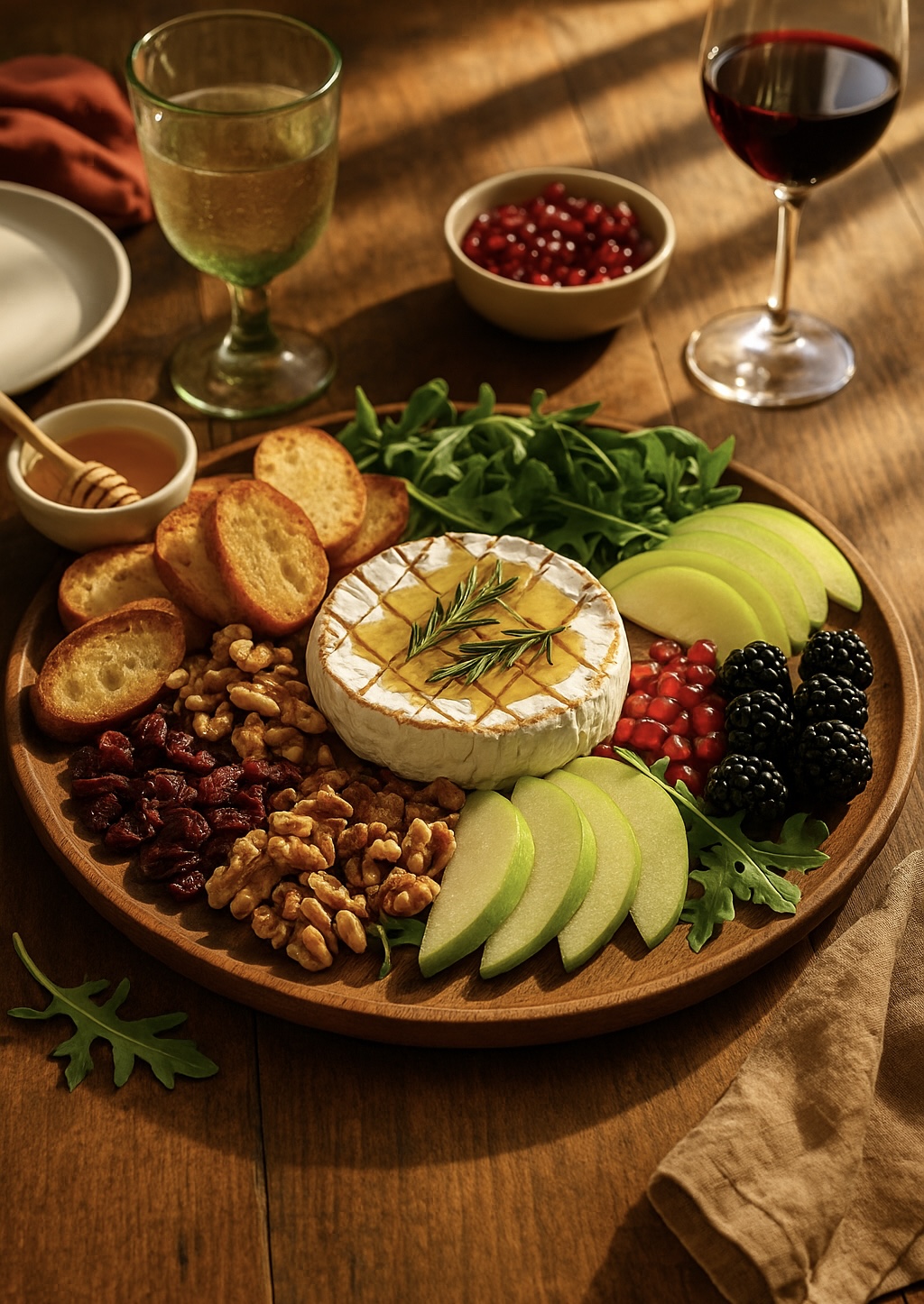 • Arrange walnuts, cranberries, blackberries or figs, apple slices, and toasted baguette on the board. Sprinkle with pomegranate seeds and garnish with arugula.