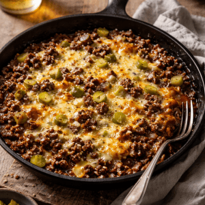 All the comfort and indulgence of a cheeseburger, minus the bun and the mess. Savory beef, tangy sauce, melty cheese, and crispy edges — weeknight dinner with diner soul.