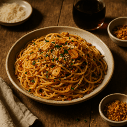 Use ramen, udon, or linguine as swaps. For less heat, reduce chili crisp or add a splash of cream. For apéro-style serving, portion into small bowls with extra garlic chips.