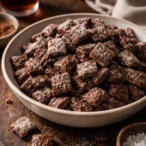 A grown-up take on classic puppy chow with dark chocolate, nutty almond butter, and a cocoa-dusted finish that’s rich, barely sweet, and dangerously snackable.