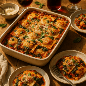 Add a ricotta-and-egg layer between the ravioli for a richer bake. Assembles well ahead and reheats nicely.