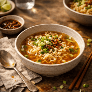 A soothing, punchy noodle soup built on ginger, garlic, and umami-rich broth — grounding, low-effort, and quietly luxurious when you need food to do emotional support.