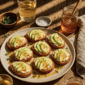 Crispy baguette slices layered with tangy goat cheese, tart Granny Smith apple, and a drizzle of hot honey — the ultimate chic party appetizer with apéro energy.