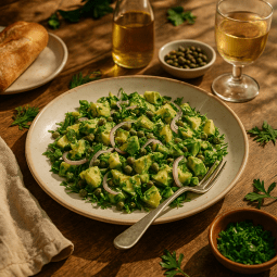 A bright, briny salad where creamy avocado meets sharp shallots, salty capers, and a tumble of fresh herbs — chic, quick, and endlessly snackable.