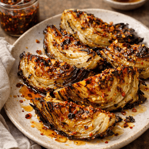 Thick cabbage wedges roasted until deeply caramelized and jammy, finished with chili crisp for crunch and honey for glossy sweetness. A vegetable side that eats like a main.