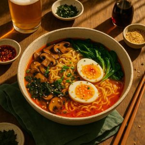 A quick, cozy bowl of spicy miso ramen with a glossy, punchy broth and plenty of toppings — dinner-party energy with pantry effort.
