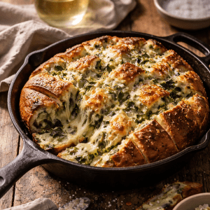 All the glory of spinach artichoke dip baked into a golden, tearable loaf. Creamy, cheesy, and slightly messy in the best way.