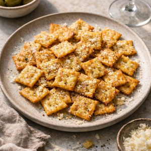 Buttery, crisp snack crackers tossed with truffle salt and sharp Parmesan, baked low and slow for maximum flavor and minimal effort.